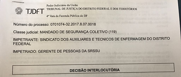 Diante das reclamações dos servidores, que algumas unidades de saúde do DF estavam solicitando o comprovante de passagens mensais dos técnicos em enfermagem que moram em outros estados, o departamento jurídico do Sindate ajuizou ação, por meio do mandado de segurança coletiva, para rever o ato coator e a justiça concedeu a suspensão em caráter liminar dos efeitos da Circular 01/2017 da Gerência de Pessoal da Superintendência da Região de Saúde Sul, que corresponde a Gama e Santa Maria. A decisão saiu na última sexta-feira (03/03).