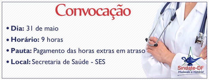 A direção do Sindate-DF convoca toda categoria para manifestar contra o atraso do pagamento das Horas Extras. A manifestação ocorrerá nesta quarta-feira (31/05) , às 9h, em frente a Secretaria de Estado de Estado (SES-DF). Se você está com as suas horas extras atrasadas há mais de 6 meses, junte-se a nós.