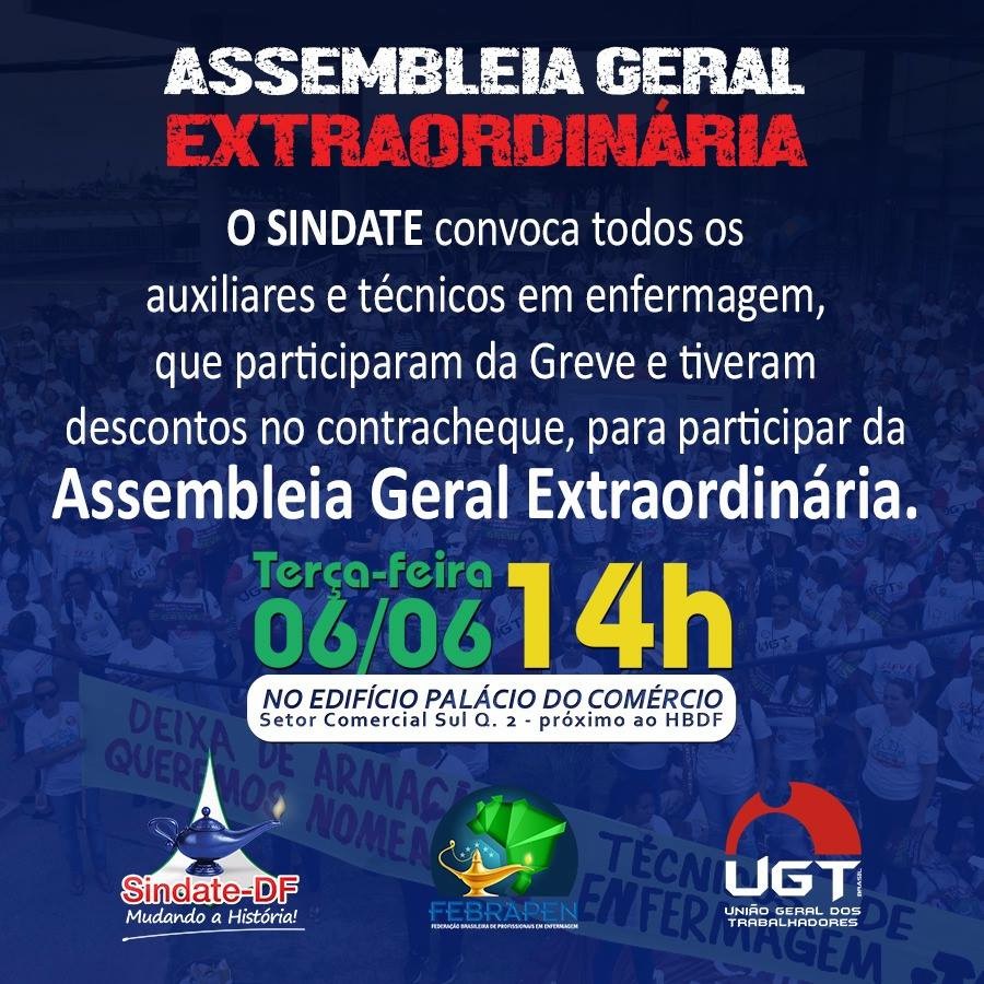 A direção do Sindate convoca todos os Auxiliares e Técnicos em Enfermagem que participaram da Greve e tiveram descontos no contracheque, para que compareçam à Assembleia Geral Extraordinária que será realizada na próxima terça-feira (06/06), às 14h, no Auditório do Edifício Palácio do Comércio, que fica próximo ao Hospital de Base.