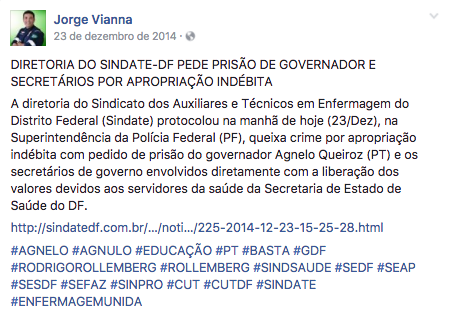 “Esse governo está se apropriando de um recurso que não é dele. Os valores estão sendo descontados dos servidores e o governo atrasa até mais de um mês. Nós recebemos apenas 10% do valor descontado dos servidores que são sindicalizados e isso configura apropriação indébita e nós vamos recorrer tanto a Justiça quanto à Polícia Federal, como já fizemos uma vez, no final do governo Agnelo e vamos pedir a prisão do governador Rodrigo Rollemberg e dos secretários de governo que estiverem envolvidos na apropriação de um recurso que é nosso, por direito. ”, ameaçou.