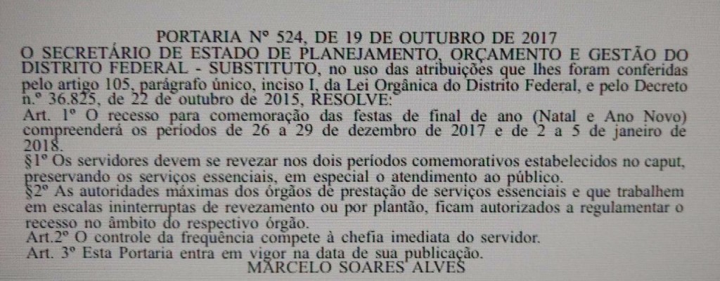 A Secretaria de Estado de Planejamento, Orçamento e Gestão do Distrito Federal (Seplag-DF) divulgou, no dia 19 de outubro deste ano, o recesso para comemoração das festas de final de ano (Natal e Ano Novo).