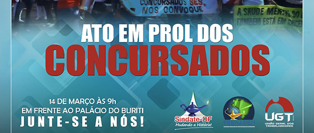 Não é de hoje que o Sindate luta pelas nomeações dos colegas aprovados, pois entende que vários serviços e órgãos do governo estão fechados ou sem atendimento devido à falta de servidores. Por isso, o Sindate convida todos concursados aprovados para o GDF, para participar de um grande ato em favor das nomeações que acontecerá no dia 14 de março, às 9h, em Frente ao Palácio do Buriti. Contamos com sua presença.