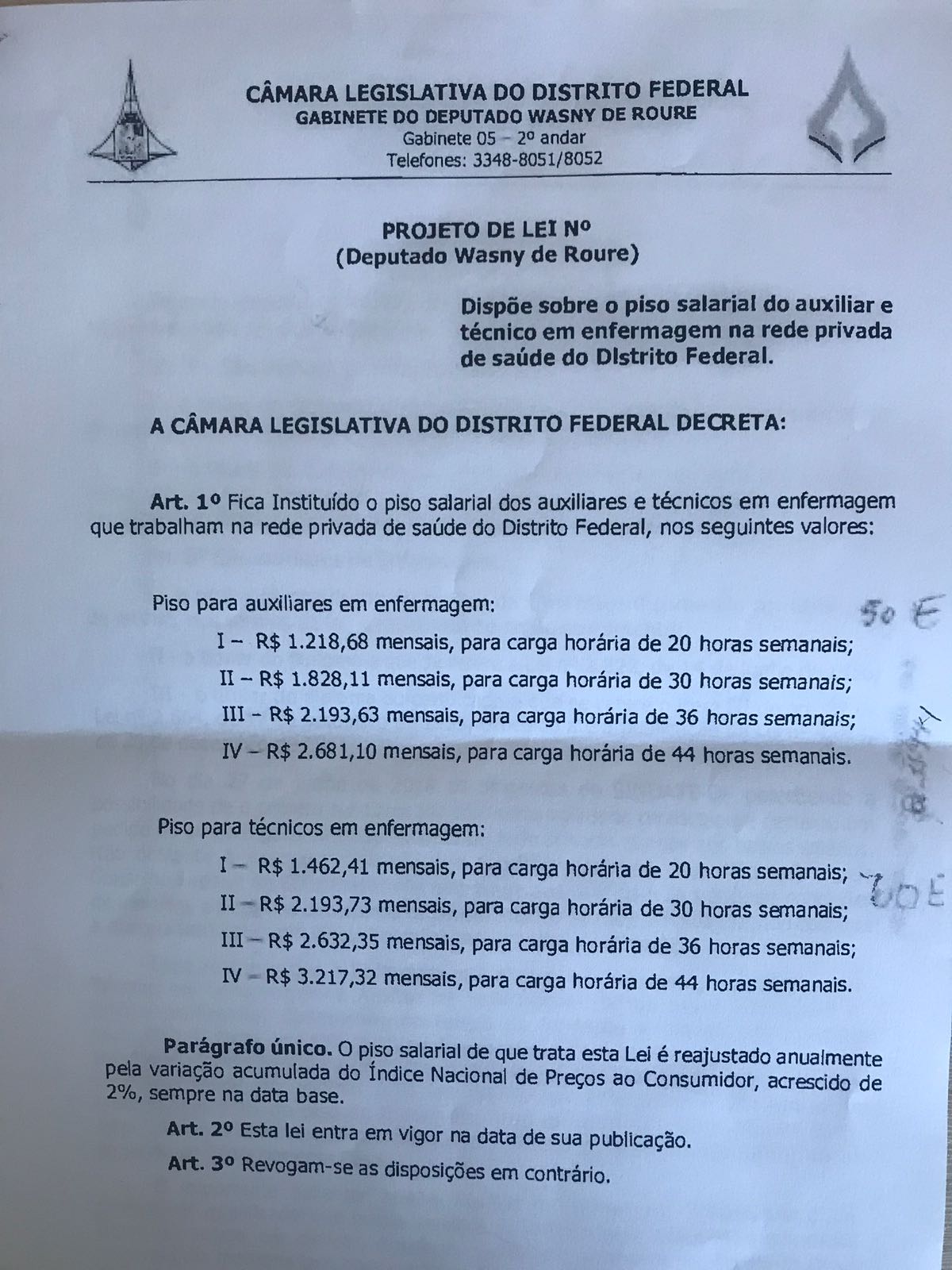 Na manhã da quinta-feira (28/06), dia em que encerra o primeiro semestre na Câmara Legislativa do Distrito Federal (CLDF), os dirigentes do Sindate João Cardoso, Josiane Jacob e o diretor licenciado Jorge Vianna, foram ao gabinete do deputado Wasny de Roure (PT), apresentar o projeto de lei que estabelece o piso salarial dos auxiliares e técnicos em enfermagem da iniciativa privada.