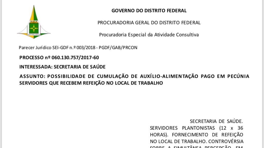 Na última quinta-feira (14/06), completou uma semana da divulgação da portaria mais humilhante, Portaria 501, de 28 de maio de 2018, em que o governador Rodrigo Rollemberg, juntamente com o Secretário de Saúde publicaram, no dia (06/06), no DODF. A medida apelidada de “Portaria da Fome”, retirou dos servidores e acompanhantes refeições primordiais, veja aqui. A direção do Sindate teve acesso ao Parecer da PGDF do Subprocurador-Geral da PGDF, Sergio Carvalho no qual entende como razoável e indispensável o fornecimento de refeição aos servidores plantonistas. Veja abaixo o trecho retirado do parecer enviado à SES-DF.