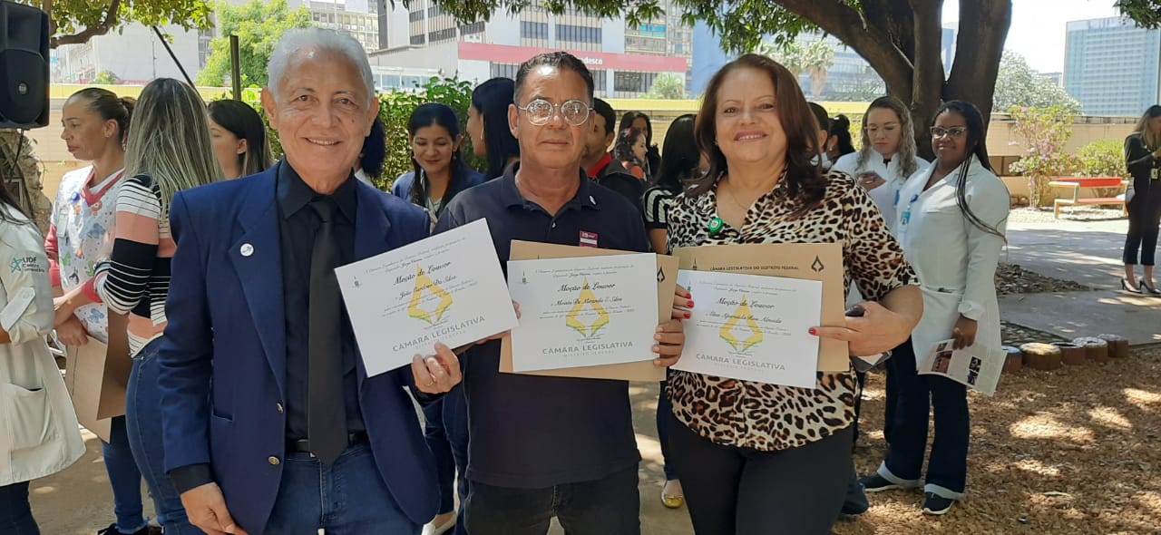 Em comemoração aos 59 anos do Hospital de Base, o presidente do Sindicato dos Auxiliares e Técnicos em Enfermagem do Distrito Federal (Sindate-DF) e cidadão honorário de Brasília, João Cardoso, e os diretores Moisés de Miranda e Elza Aparecida, juntamente com outros profissionais que atuam ou atuaram na unidade, foram homenageados nesta segunda-feira (9) durante sessão solene realizada pela Câmara Legislativa do Distrito Federal (CLDF) no jardim da unidade hospitalar. O secretário de Saúde, Osnei Okumoto, também participou da sessão.