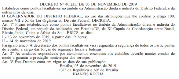 O governador Ibaneis Rocha decretou, na última terça-feira (5), ponto facultativo no Distrito Federal nos dias 13 e 14 de novembro, véspera do feriado da Proclamação da República (15). O decreto Nº 40.235, de 05 de novembro de 2019 foi publicado na edição do Diário Oficial do DF nesta quarta-feira (06). A justificativa do chefe do executivo local é resguardar a segurança” dos participantes da cúpula do Brics, marcada para esses dias em Brasília.