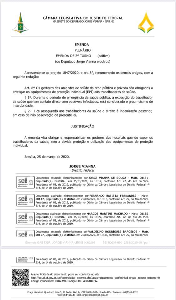 Com o objetivo de garantir medidas para proteção dos profissionais de saúde, o deputado distrital Jorge Vianna (Podemos) apresentou uma emenda ao projeto de lei nº 1.047/2020, que prevê ações para o enfrentamento da emergência de saúde pública em decorrência da pandemia causada pelo coronavírus (COVID-19), na garantia do fornecimento de Equipamentos de Proteção Individual (EPI’s) e na concessão do adicional de insalubridade em grau máximo para trabalhadores da rede pública e privada de saúde.