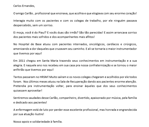 Técnico em Enfermagem, Carlos tinha 56 anos, deixa esposa e dois filhos. Ele atuava no centro cirúrgico do Hospital Regional de Santa Maria (HRSM). A causa do óbito foi em virtude de um infarto agudo do miocárdio.