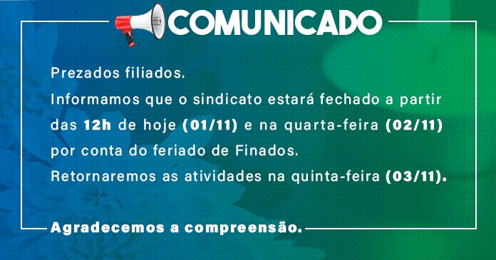 Compartilhar Facebook Twitter LinkedIn Telegram WhatsApp Email Atenção filiados! Informamos que o sindicato estará fechado a partir das 12h de hoje (01/11) e na quarta-feira (02/11) por conta do feriado de Finados. Retornaremos as atividades na quinta-feira (03/11). Agradecemos a compreensão.