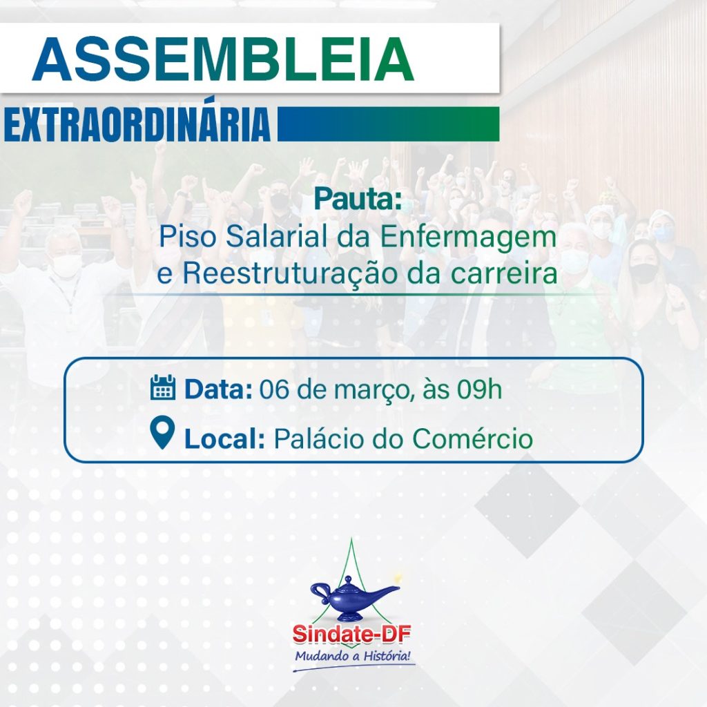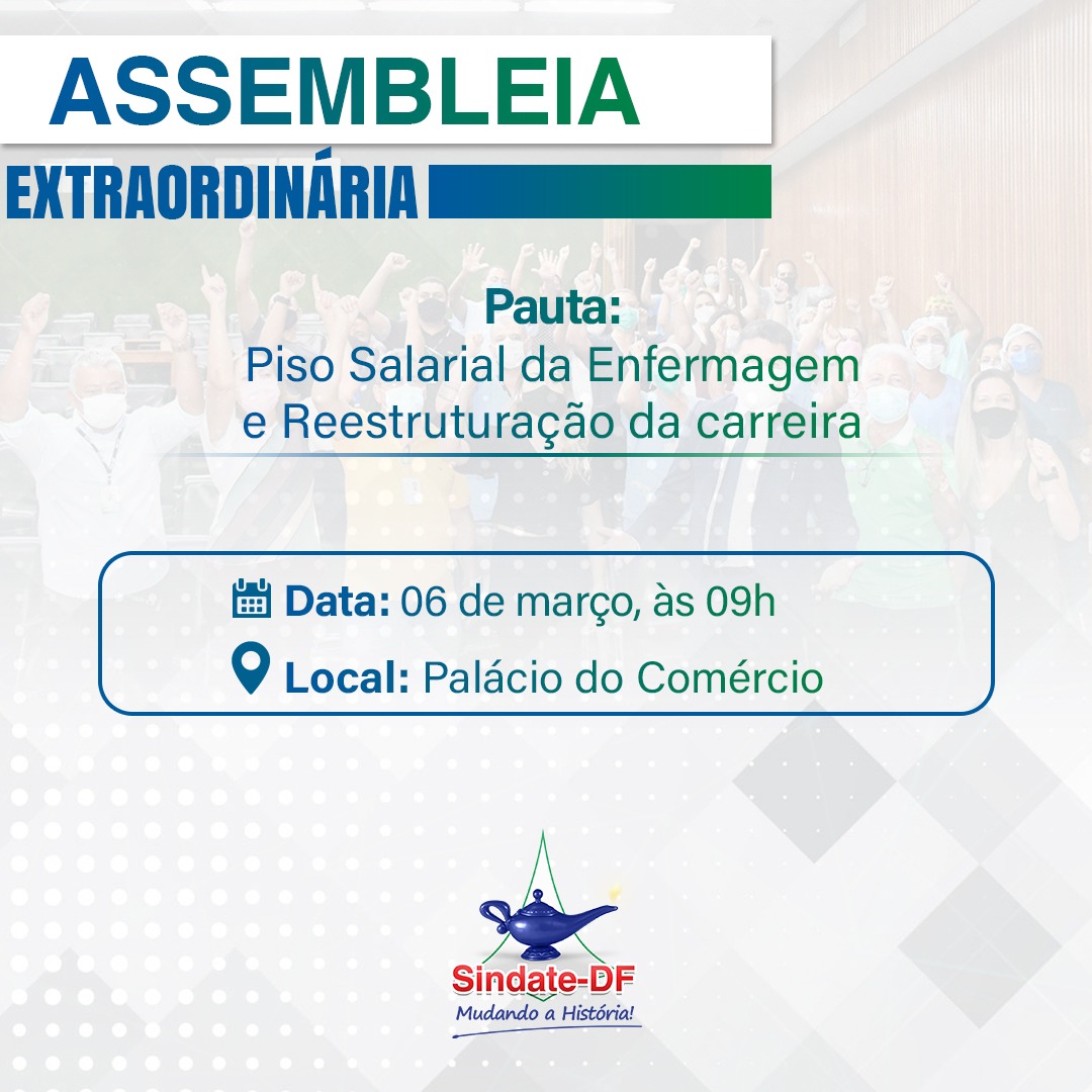Técnicos em Enfermagem da rede pública e da rede privada: no dia 6 de março, a partir das 9h, no Auditório do Palácio do Comércio, teremos uma Assembleia para tratar de duas importantes pautas: as deliberações acerca do Piso Salarial da Enfermagem e a Reestruturação de Carreira.