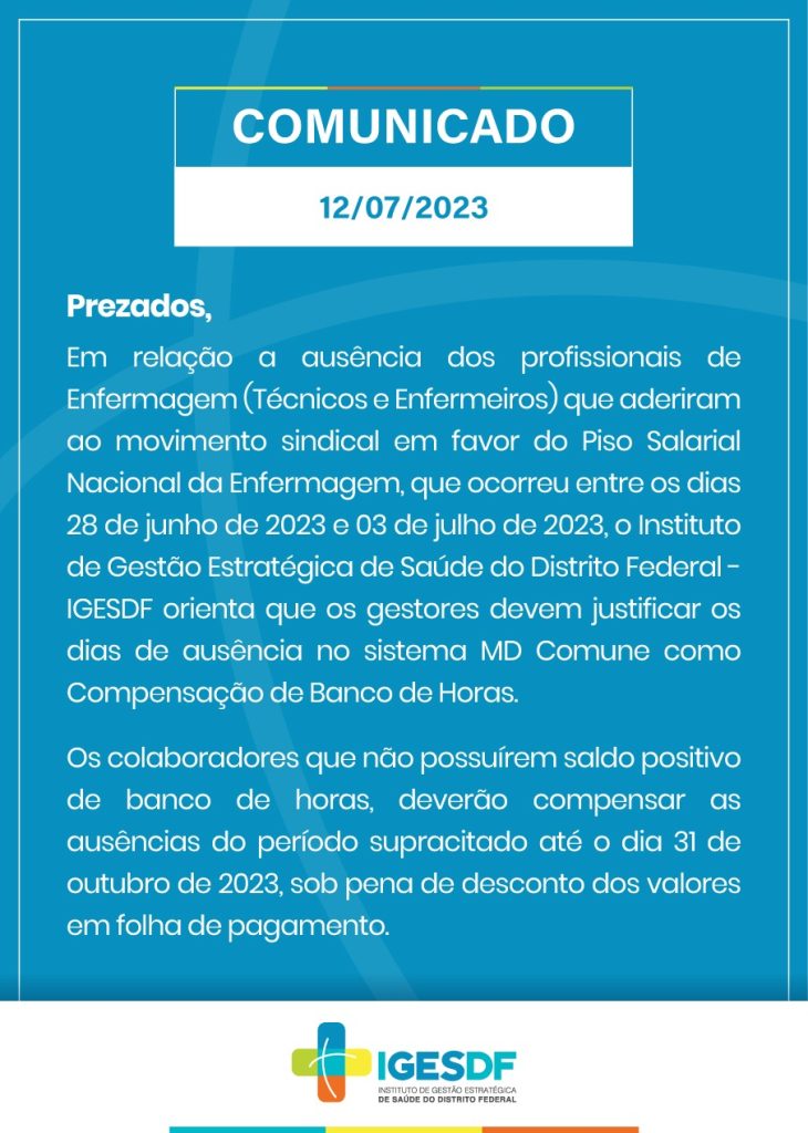 O Instituto de Gestão Estratégica de Saúde do Distrito Federal (IGES-DF) soltou um comunicado onde informa que os profissionais de enfermagem que participaram dos dias de greve (28 de junho a 03 de julho) poderão compensar as horas.
